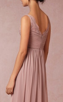 A-line gown with V neckline and soft chiffon skirt. This style features feminine lace neckline and lace strap creating an illusion looking. Though the lace straps are fixed but also can be tailored in detachable type per your specific request in order.