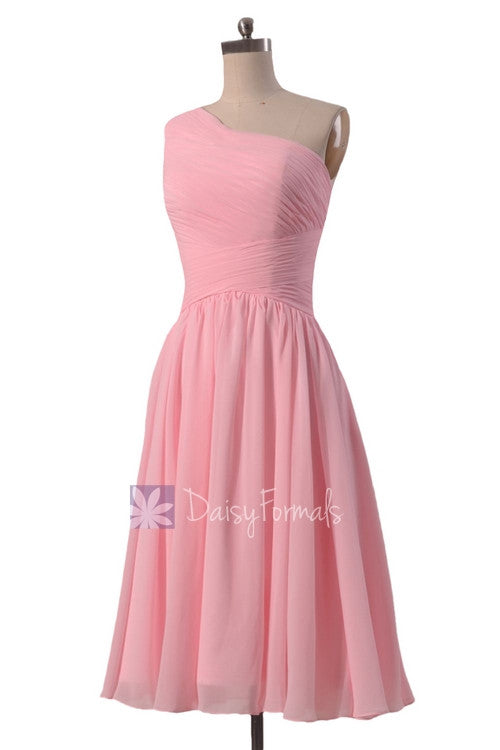 Lovely Short One Shoulder Chiffon Bridesmaid Dress Pleated Pink Formal Dress(BM351)