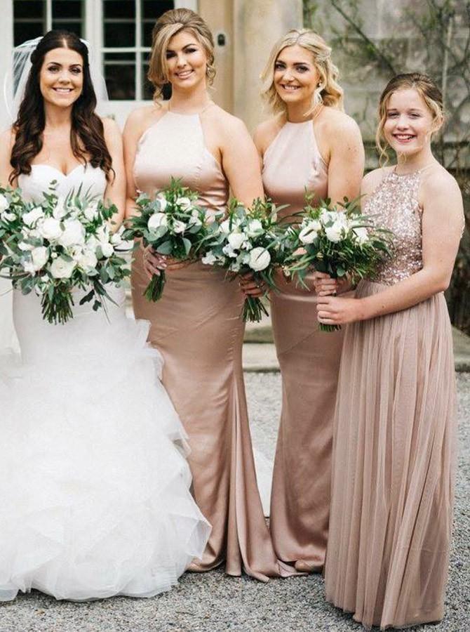Round Neck Sweep Train Sleeveless Blush Satin Bridesmaid Dress (BMA20157)