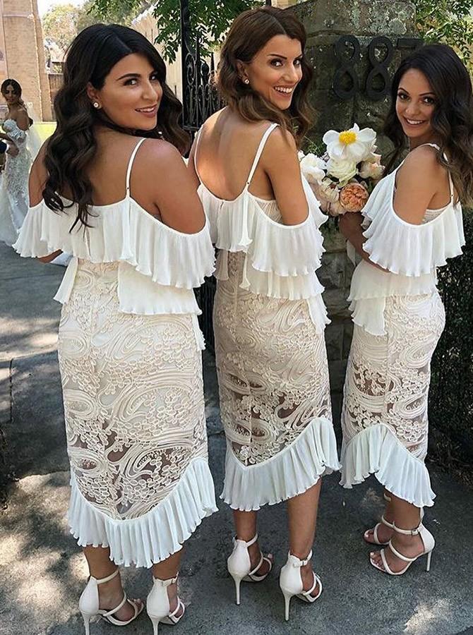 Spaghetti Straps Pearl Pink Lace Bridesmaid Dress with Ruffles (BMA20158)