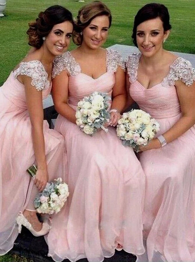 Stunning Scoop Cap Sleeves Floor Length Pink Chiffon Bridesmaid Dress with Beading (BMA2031)