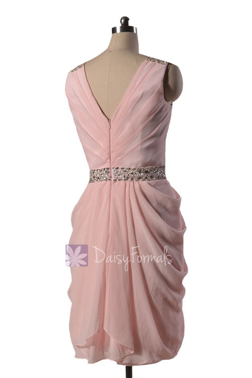 Blush Pink Party Dress Beaded V-Neck Pink Chiffon Bridesmaid Dress Short Pink Prom Dress (BM875)